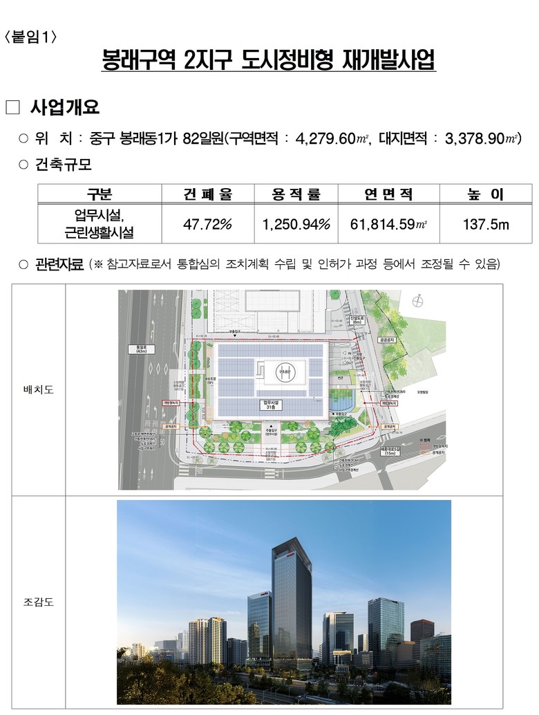 조남준 서울시 도시공간본부장은 “봉래구역 2지구 통합심의 통과로, 낙후된 대상지에 대규모 업무공간과 양질의 편의시설을 조성함으로써 지역 활성화에 기여하고, 서울역 일대의 개발사업과 연계하여 대대적 공간변화를 가져올 것으로 기대된다”고 말했다.